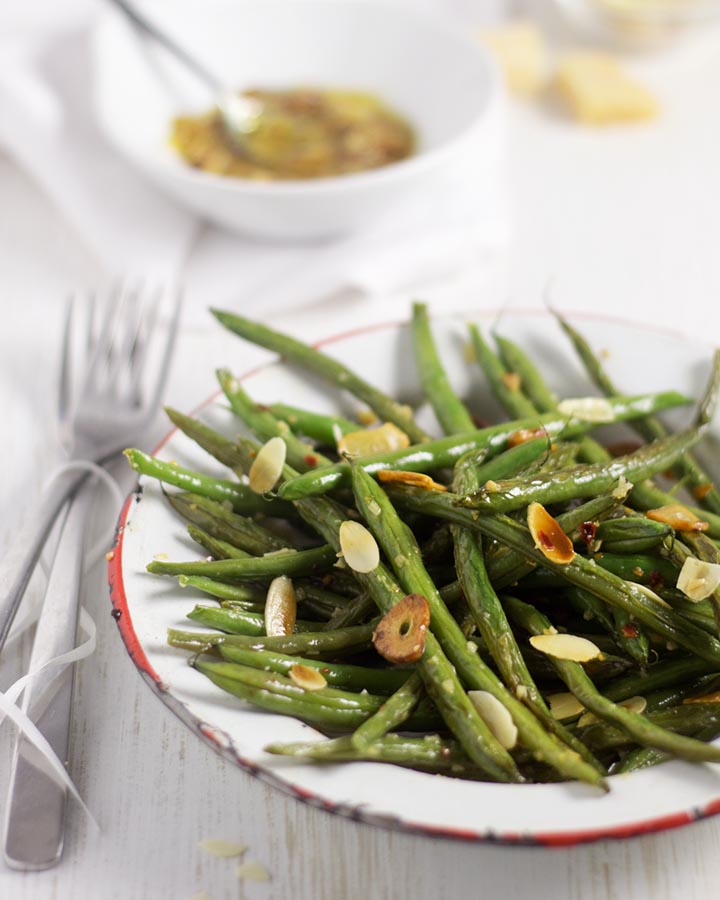 1 sartén de judías verdes al ajillo con almendras fileteadas