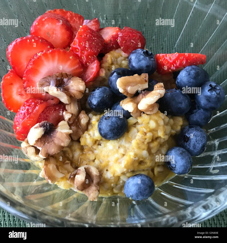 Avena cortada en acero con calabaza y arándanos