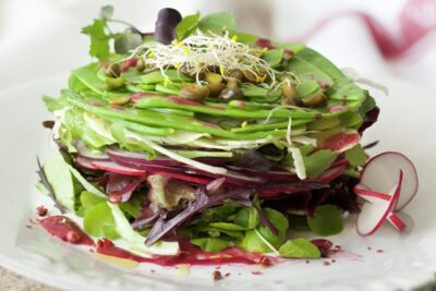 Ensalada de hierbas verdes con vinagreta de arándanos