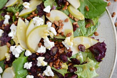 Leer mas...Ensalada de peras con cerezas secas y nueces confitadas
