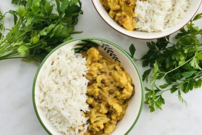 Leer mas...Arroz de coliflor al curry con lentejas y chalota crujiente (inspirado en Mujadara)