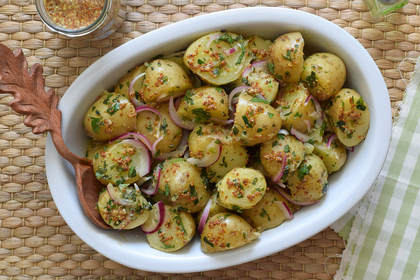 Una vez preparado el aderezo, todo lo que queda por hacer es agregar hierbas frescas picadas y cebolla verde a las papas hervidas y combinar.