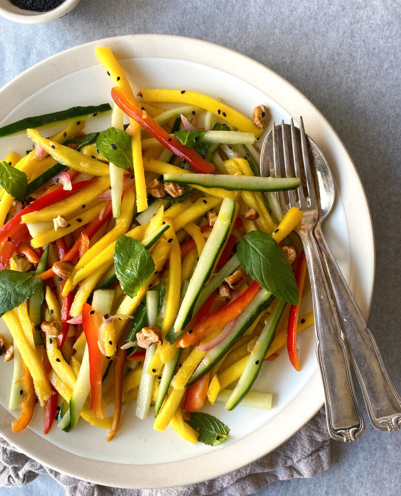 ¡Una ensalada rápida y fácil de inspiración tailandesa con verduras frescas y mango! Rocío un aderezo de maní simple para un acompañamiento delicioso o agrega una proteína de su elección para convertirlo en un plato principal. AutorPanadero minimalista Imprimir AHORRARSALVADO 5de42votos Tiempo de preparación15minutos minutosTiempo Total15minutos minutos Porciones CursoEnsalada, AcompañamientoCocinaSin gluten, De inspiración indonesia, De inspiración tailandesa, VeganoApto para congeladorNo¿Se mantiene?3 días Evita que tu pantalla se oscurezca
