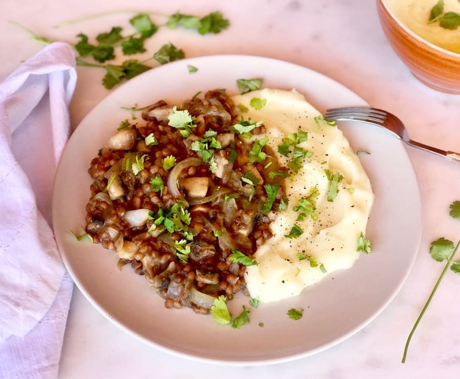 Comienza con chalotas salteadas y champiñones sazonados con aminoácidos de coco, sal y pimienta para darle un sabor rico y profundo. Luego vienen las lentejas, el tomillo para darle sabor y el caldo de verduras. Mientras eso se está cocinando a fuego lento, comience con el puré de papas.