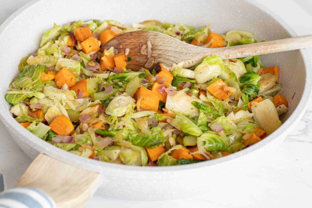 Hash de desayuno con coles de Bruselas y batatas