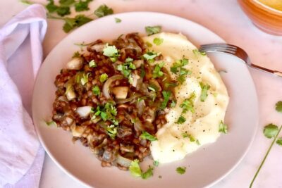 La base de este plato es una salsa/guiso de champiñones y lentejas.…