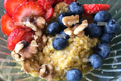 Leer mas...Avena cortada en acero con calabaza y arándanos